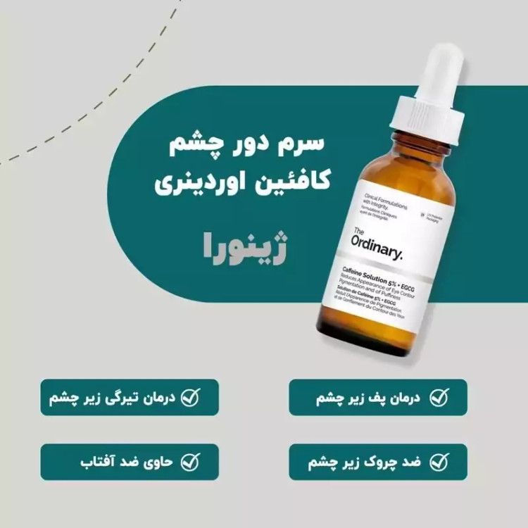 ویژگی و خواص سرم کافئین دور چشم اوردینری اصل از بین بردن تیرگیهای زیر چشم رفع پف دور چشم کمک به رفع چین و چروک دور چشم احیا پوست زیر چشم محافظت تمام عیار از پوست ناحیه زیر چشم ترمیم و بازسازی بافت پوست زیر چشم روشن کردن پوست زیر چشم افزایش گردن خون در پوست زیر چشم بافت سبک و جذب سریع حاوی کافئین با غلظت بالای 5 درصد ضد التهاب دور چشم افزایش شفافیت و درخشندگی ناحیه دور چشم دارای خاصیت آنتیاکسیدان قوی یکدست کننده رنگ پوست اطراف چشم مناسب برای تمام افراد با هر نوع پوستی فرمولاسیون بر پایه آب فاقد هر گونه ماده مضری مانند پارابن، الکل، گلوتن و سولفات