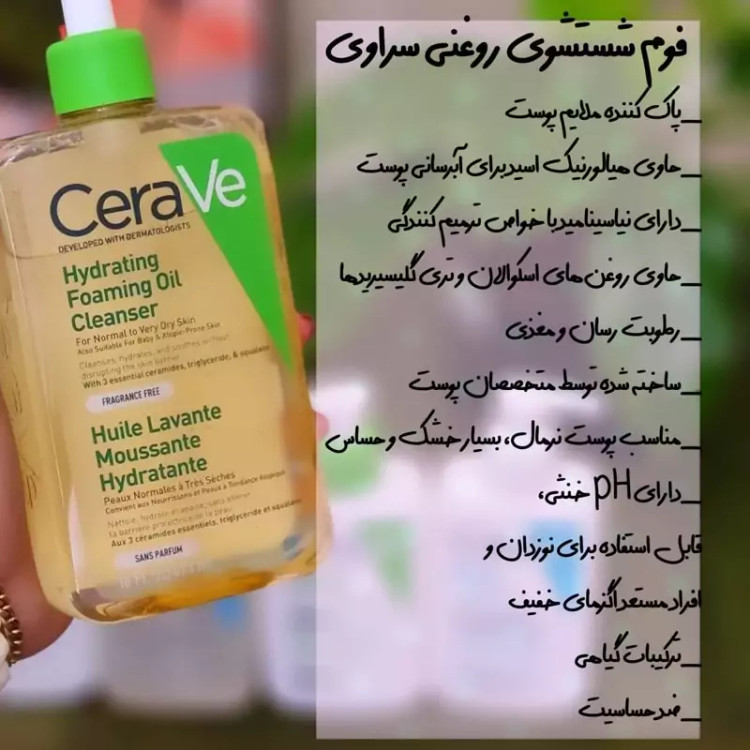 فوم شستشوی روغنی سراوی Cerave Hydrating Foaming Oil حجم 473میل پاک کننده ملایم پوست 2. حاوی هیالورنیک اسید برای آبرسانی پوست 3. دارای نیاسینامید با خواص ترمیم کنندگی 4. حاوی روغنهای اسکوالان و تری گلیسیریدها 5. رطوبت رسان و مغذی 6. ساخته شده توسط متخصصان پوست 7. مناسب پوست نرمال، خشک، بسیار خشک و حساس 8. دارای pH خنثی، قابل استفاده برای نوزدان و افراد مستعد اگزمای خفیف 9. ترکیبات گیاهی 10. ضد حساسیت 11. صابون، پارابن، عطر و مواد با منشاء حیوانی