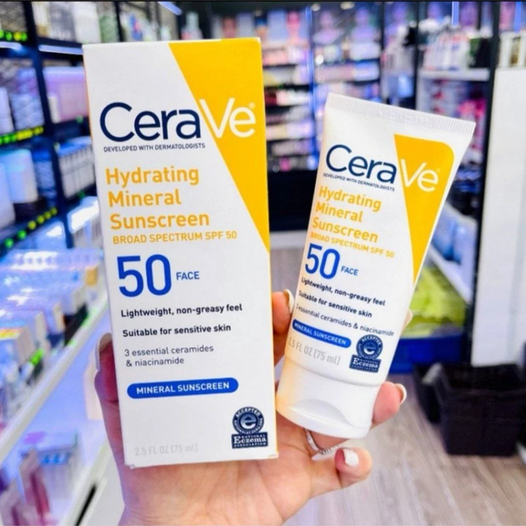 ضدآفتاب و ضدلک بی رنگ برپایه آب SPF50 صددرصد اورجینال سایز بزرگ Cera Ve HYdrating Mineral Sunscreen 75میل مخصوص انواع پوست حتی پوست های حساس و آسیب دیده دارای مواد معدنی حاوی ویتامین ها ضد لک و آبرسان فوری تایید شده سراوی بارکد اروپایی صددرصد اصلی ساخت فرانسه تاریخ جدید 2028
